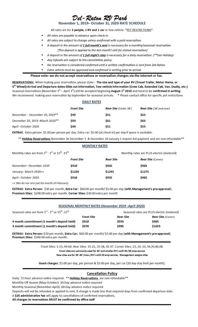 Rates rv sites options. Del raton rv park has been family owned operated since 1973. Details open all year last year s rate. We pride ourselves in giving our customers residents personal attention service.
